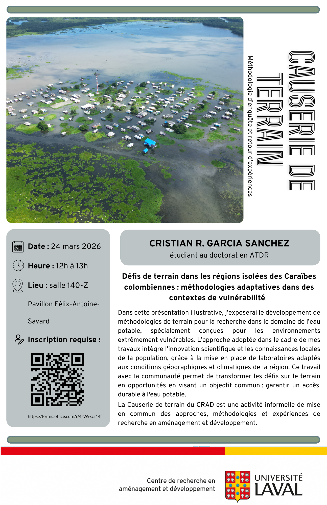 Vous êtes conviés à l’activité intitulée « Causerie de terrain » organisée par le Centre de recherche en aménagement et développement (CRAD).